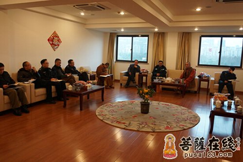 菩萨在线上海讯 2015年2月3日下午,上海宁国禅寺春节开放安保工作协调会在宁国禅寺方丈室三楼举行。上海市徐汇区委常委、上海市徐汇区统战部长冷旭生,上海市徐汇区统战部副部长、上海市徐汇区民宗办主任向卫华,上海市徐汇区公安分局副局长张警及徐汇区分局大保办、消防、交警、治安、华泾镇综治办、城管、市容环卫等有关部门的负责人约20余人参加会议。