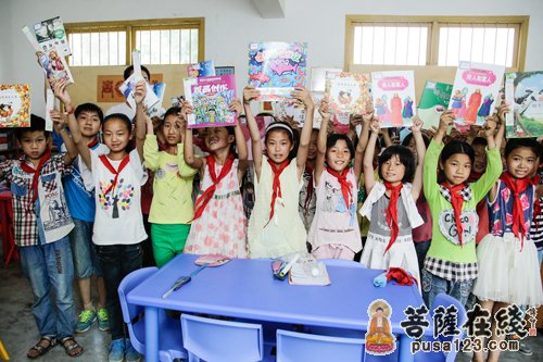 小朋友们手拿最爱的书籍与法师合影留念