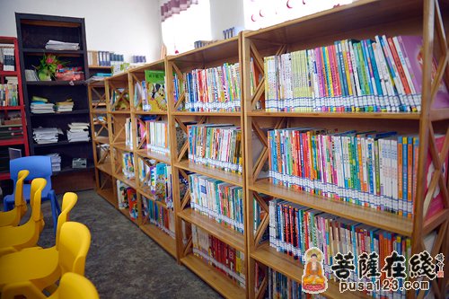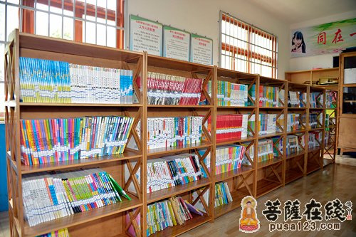 一个多小时之后,仁镇法师及两名志工们终于来到了在山那边的学校。这里的图书室是他们走访学校至今见过的最宽敞的图书室。校长解释说:“因为以前这所学校包括初中和小学,如今初中搬走了只剩下小学,所以教室资源比较充足。从学前班就已经在这里的陈同学如今在读六年级。从四年级开始她就经常来图书室看书,只是以前可看的书很少。现在最喜欢看故事书的她经常将目光锁定在故事类图书架上,最近刚看完的是江姐和白毛女故事。而两年级的吴同学则喜欢看漫画书,每周二和周四的中午经常能看见他在图书室看书的身影。”