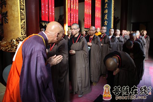 则竹秀南长老与每班的新戒弟子一一问讯(图片来源:菩萨在线 摄影:慧宏)