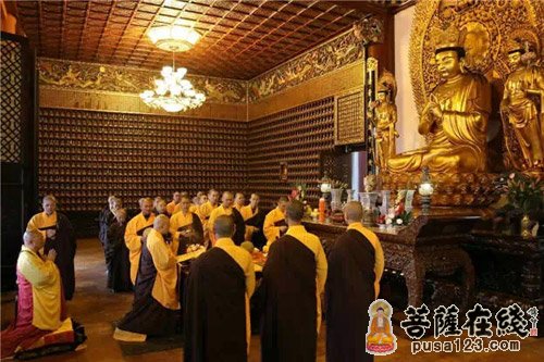 傍晚6时,参加法会的法师及众居士,集中在大雄宝殿内补经——齐心同诵《金刚经》和《药师经》。