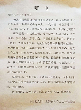 惊悉中国佛教协会咨议委员会主席、江苏省佛教协会名誉会长、苏州灵岩山寺方丈、一代高僧、净宗泰斗上明下学老和尚示寂,上海真如寺四众殊感痛惜,谨致深切哀悼!