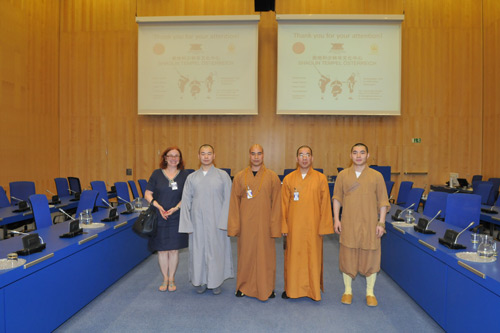 奥地利文化中心的法师们与联合国工业发展组织领导合影 传承文化度众生,少林禅医利身心。少林寺方丈永信法师慈悲,特派少林药局延观法师到奥地利少林文化中心进行义诊,自2015年4月初开始,已